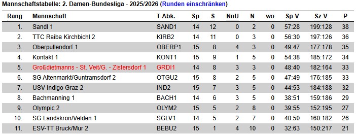 Mit dem siebenten Sieg in Serie setzten die Spielerinnen von GRDI1 ein deutliches Ausrufezeichen und unterstrichen eindrucksvoll ihre Entwicklung in ihrer erst zweiten Bundesliga-Saison. Aktuell liegt das Team GRDI1 (Großdietmanns – St. Veit/G. – Zistersdorf) mit 33 Punkten und einem Spiel weniger auf dem starken fünften Tabellenplatz. Der Rückstand auf Rang drei beträgt lediglich zwei Zähler – die Spitze bleibt damit in Reichweite.